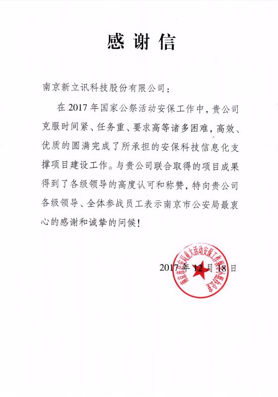 2017年12月13日,是第四個南京大屠殺死難者國家公祭日,也是南京大屠殺死難者遇難80周年,黨和國家領導人出席在侵華日軍南京大屠殺遇難同胞紀念館并參加國家公祭儀式。為此,新立訊成功建設侵華日軍南京大屠殺遇難同胞紀念館的安保科技信息化系統,并順利配合相關機構完成國家公祭日期間的政保任務,保證國家公祭日活動順利開展。2018年2月7日,新立訊收到南京市公安局重大活動安保工作領導小組辦公室針對此安保科技信息化系統建設的感謝信,對新立訊高效、優質的項目建設工作予以高度評價并致以衷心感謝。