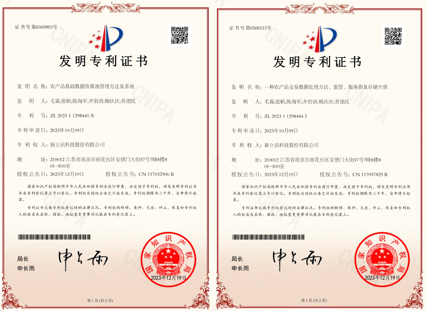 2023年12月,新立訊在農(nóng)產(chǎn)數(shù)據(jù)交易領(lǐng)域再獲4項發(fā)明專利。發(fā)明專利涵蓋了農(nóng)產(chǎn)數(shù)據(jù)交易與防偽鑒真多個方面,包括數(shù)據(jù)采集、處理、分析和應(yīng)用等,將有效提高農(nóng)產(chǎn)交易數(shù)據(jù)效率和可持續(xù)性。